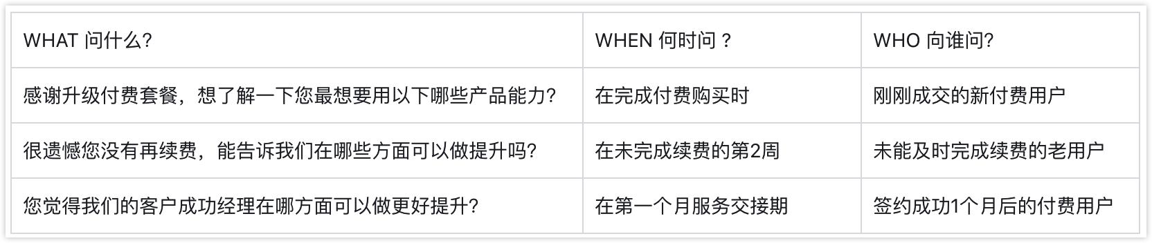 绝大多数的客户成功团队是通过个人微信、企业微信、电话等方式,与客户进行后续沟通的。但这个场景下多数客户已经脱离系统,因此建立二次联系获得的价值信息极为有限,特别是当客户已有流失风险时,基本上处于半失联状态。所以,需要在系统内,特别是在客户购买套餐结束及客户处于流失状态时,倾听客户的声音。