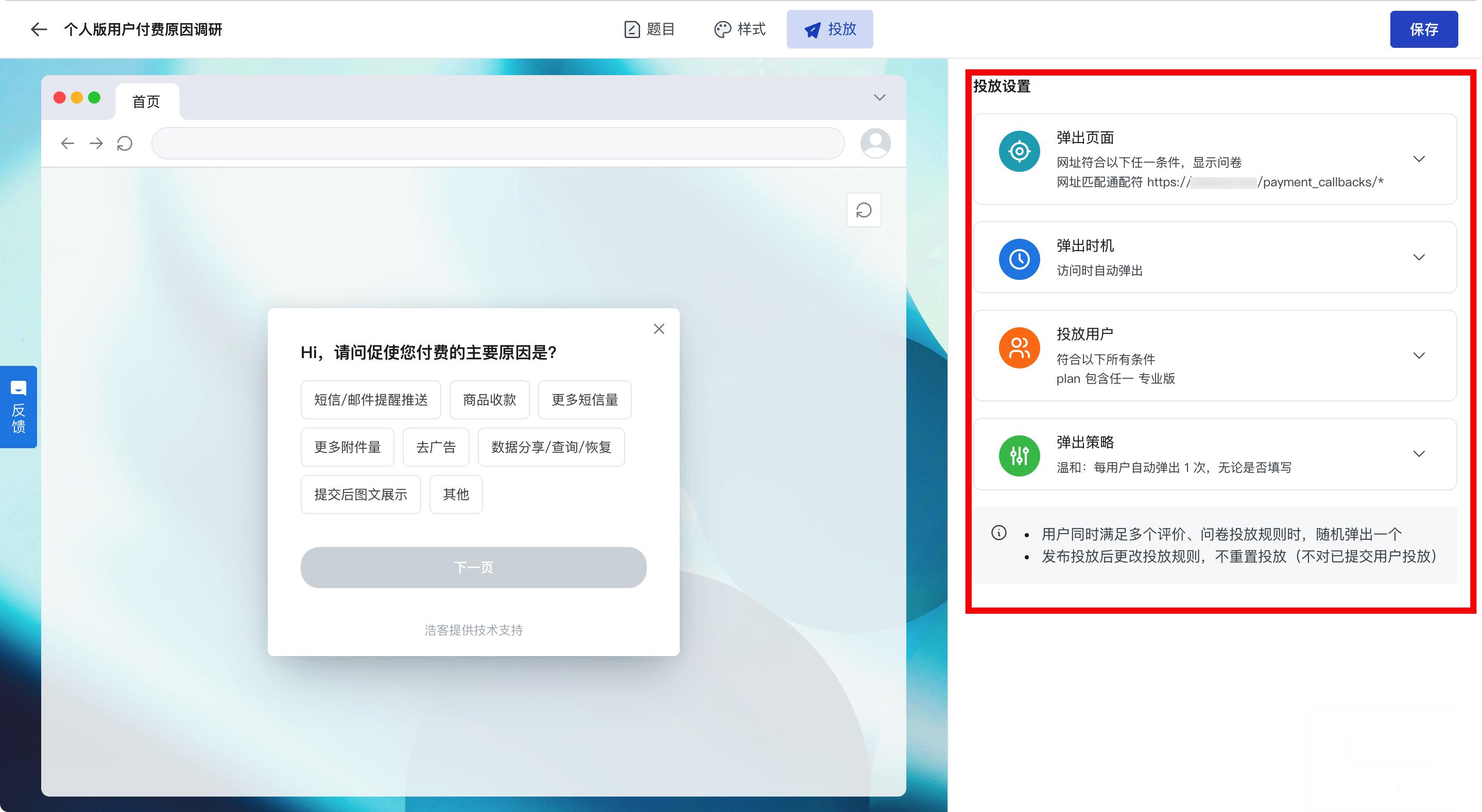 就像使用传统在线问卷一样,你可以从设计问卷开始,结合自己的业务创建题目、设置跳转逻辑,还可以自定义样式来匹配你的产品风格。更重要的是,浩客本身就是依托于数字化产品的应用内调研工具,所以支持通过 X-SDK 来完成用户身份传递。产品经理、UED 就可以在后台进行灵活地投放配置了。