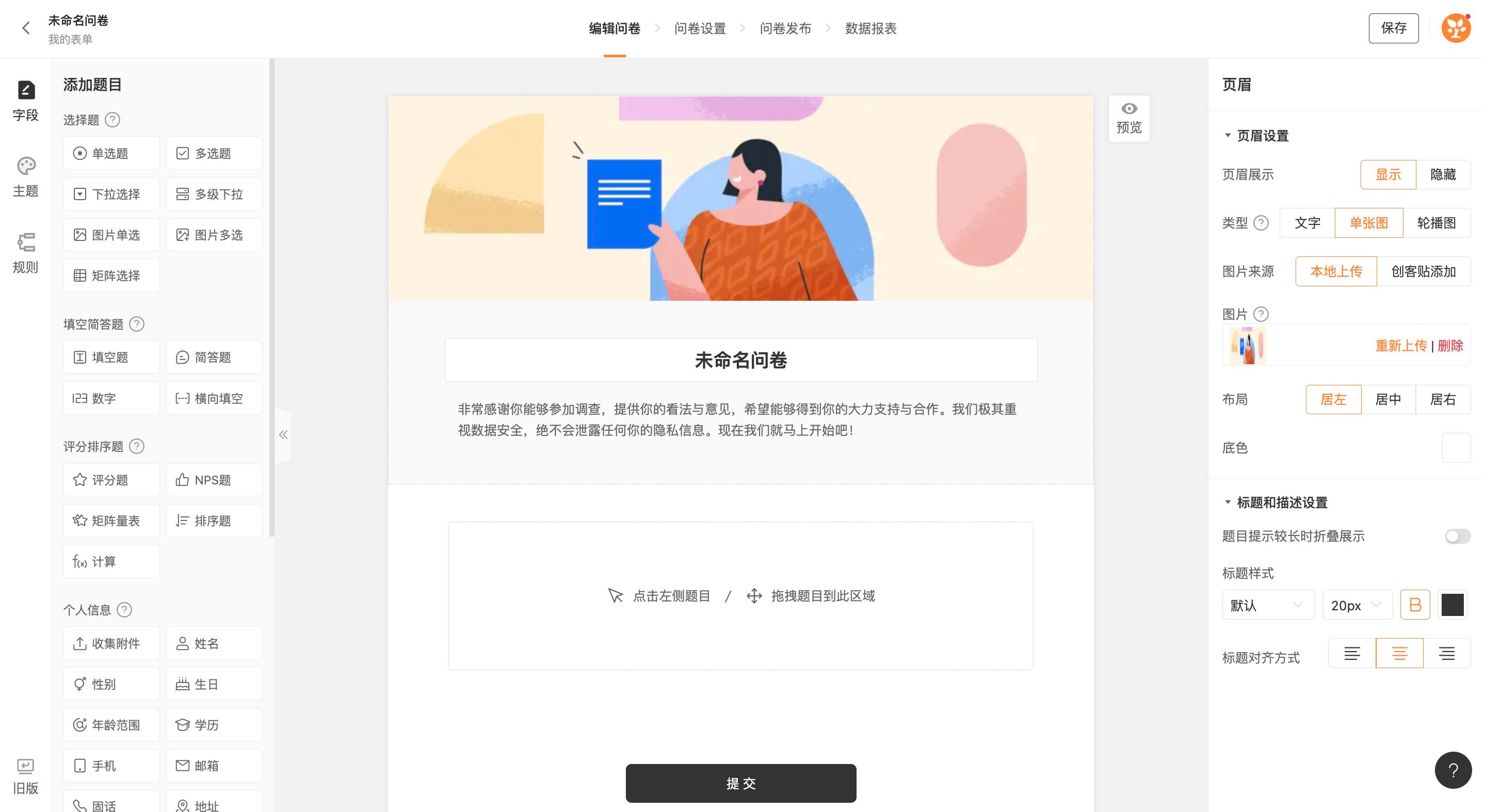 表单问卷降低了普通人收集数据、管理数据的门槛。当要发起调研的时候,新建一个表单、编辑题目、美化页面、设置简单的投放规则,就可以快速获取链接、二维码去发布了。